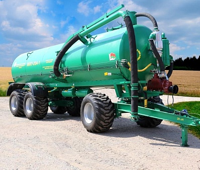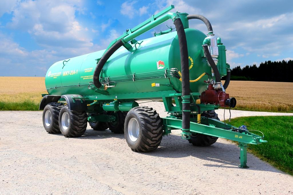 Машина для внесения жидких органических удобрений МЖУ-20А предназначена для самозагрузки, транспортирования и внесения жидких органических удобрений.   Отличительным признаком новой машины является  трёхосная ходовая система вместо двухосной с целью снижения давления на почву и снижения нагрузки на ТСУ трактора.