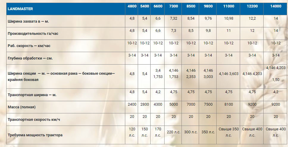 Культиваторы стерневые комбинированные «LANDMASTER» предназначены для ресурсосберегающей обработки почвы без оборота пласта под посев озимых и яровых зерновых культур по стерневым фонам, под пожнивные и покосные посевы, а также для зяблевой обработки и весновспашки. Глубина обработки достигает 14-15 см.