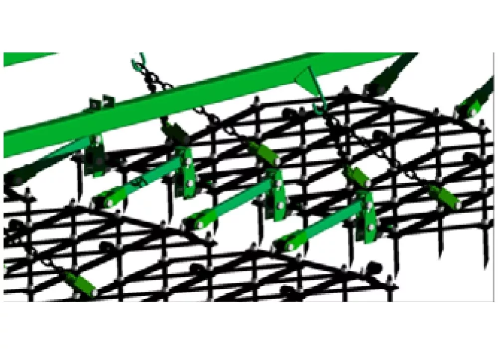 ▶ Оригинальная жесткая поводковая система закрепления зубовых борон исключает отклонение от прямолинейного движения бороны и заскакиванию борон друг на друга во время работы, обеспечивает прямолинейность хода борон и повышение качества выполнения технологического процесса.