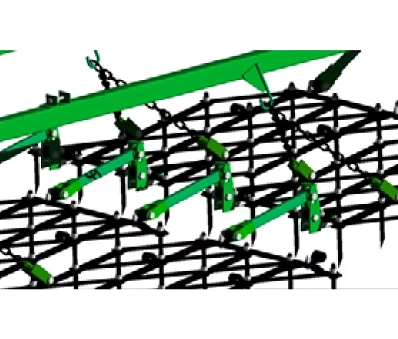 ▶ Специальный кронштейн закрепленный на первом ряде зубовых борон обеспечивает оптимальный угол установки поводков второго ряда, исключая при этом зарывание борон второго ряда.