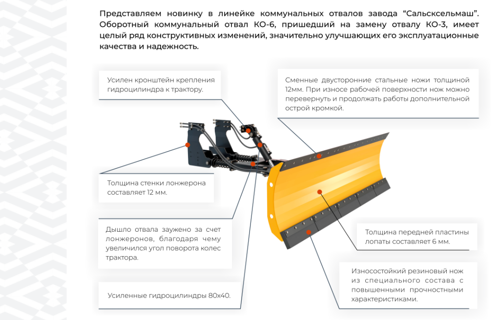 В серийное производство вышел оборотный коммунальный отвал КО-6, пришедший на замену хорошо знакомому пользователям отвалу КО-3. По сравнению с предшественником модель претерпела значительные конструктивные изменения, такие как: