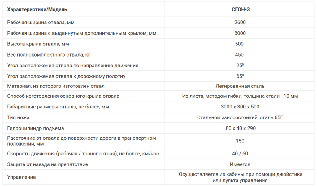 СГОН-3 изготавливается методом гибки из двойного листа легированной стали, что предает ему особую прочность, а форма крыла обеспечивает высокую эффективность при его работе. Конструкцией предусмотрена пружина гидроподжима отвала к дорожному полотну, которая регулирует давление режущей кромки, и в тоже время выполняет защитную функцию при наезде на препятствие.