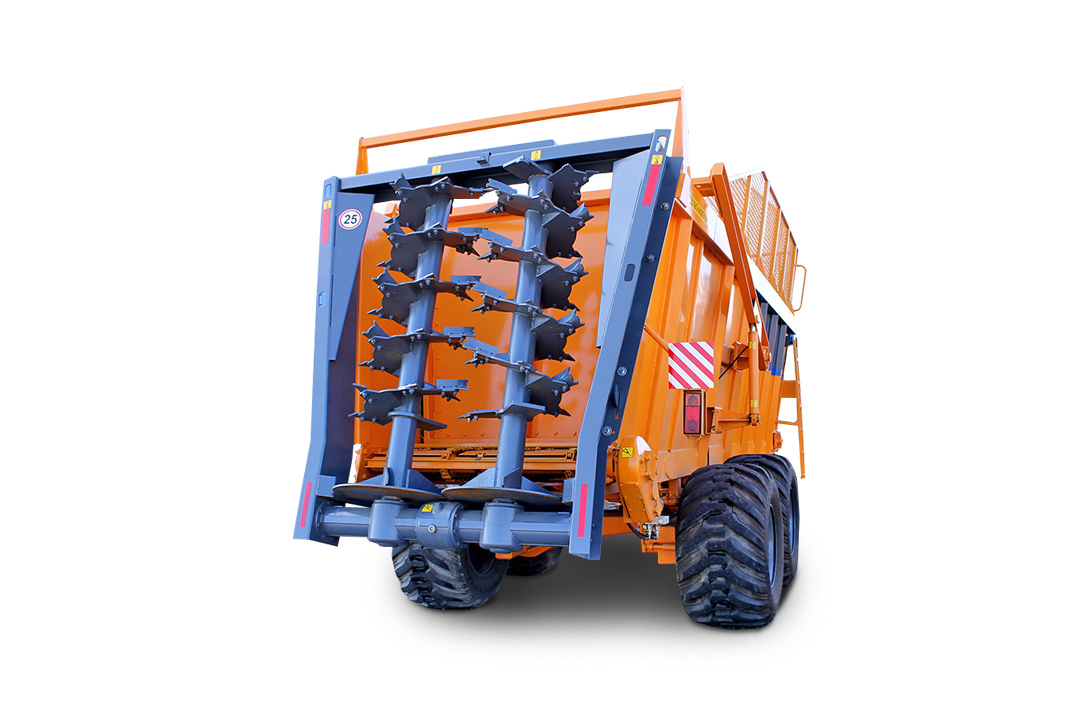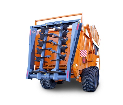 Для внесения удобрений задний борт поднимается гидроцилиндрами в крайнее верхнее положение, на тракторе включается вал отбора мощности для привода рабочих органов. Удобрения из кузова цепочно-скребковым транспортером перемещаются к распределяющему устройству. Вращающиеся вертикальные шнеки захватывают поступившую органическую массу, измельчают ножами и равномерно разбрасывают лопатками по поверхности поля. Доза внесения удобрений устанавливается изменением скорости движения подающего цепочно-скребкового транспортера.