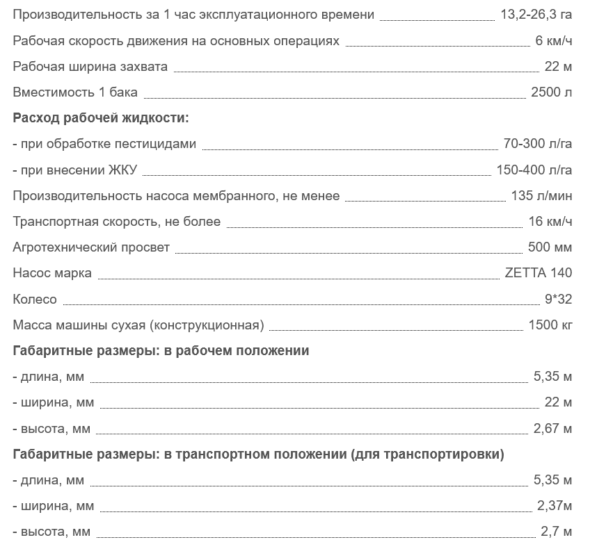Прицепной опрыскиватель ОП 22-2500 был спроектирован с учетом всех современных требований применимых к данному виду техники. При этом особое внимание уделялось прочности металлоконструкции рамы и штанги, надежности гидросистемы, качественному распылению раствора. Опрыскиватель ОП 22-2500 оснащен комплексом оборудования, который обеспечивает высокую производительность, надежность, удобство в работе, а также делает его эксплуатацию экологически безопасной.