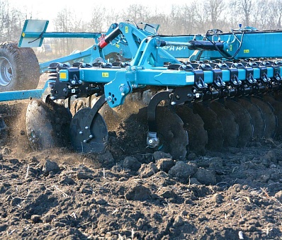 Взаимное расположение дисков рабочих органов, а также пружинного блока защиты от перегрузок позволяют работать на каменистых почвах и на полях с большим количеством растительных остатков.