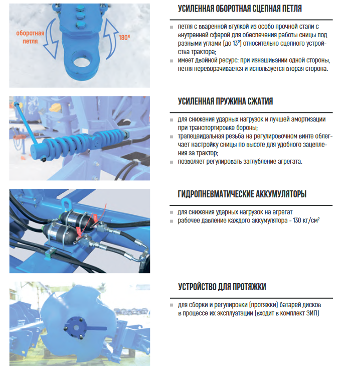 Вместе с оптимально устроенной конструкцией рабочих органов дисковая борона БДТ «Вепрь» имеет и абсолютно надежную сборку, которая включает в себя прочную центральную раму из труб сечением 200х100х10 мм, защищенные от механических повреждений подшипниковые узлы, гидропневмоаккумулятор и усиленные гидроцилиндры, которые изготовлены по итальянской технологии.