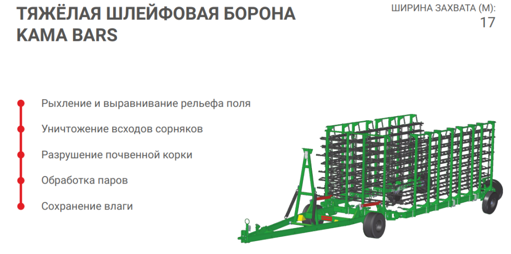 Тяжёлая шлейфовая борона KAMA BARS предназначена для обработки зяби с целью поверхностного рыхления, выравнивания почвы, уничтожения нитевидных всходов сорняков и сохранения влаги. Эффективно использование борон для обработки паров с целью разрушения почвенной корки.