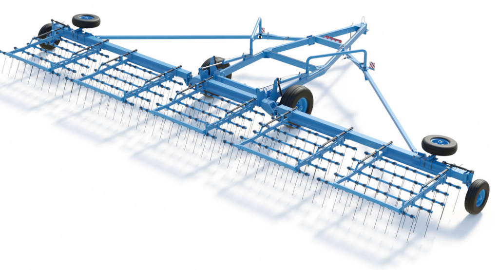 Борона с пружинным зубом полуприцепная гидрофицированная тяжелая ПОБЕДА БЗГТ-15. Ширина захвата бороны — 15,9 м. Производительность 15-23 гектара в час.