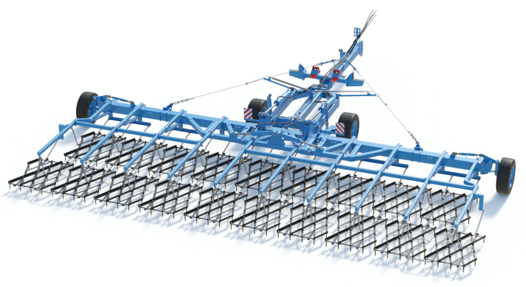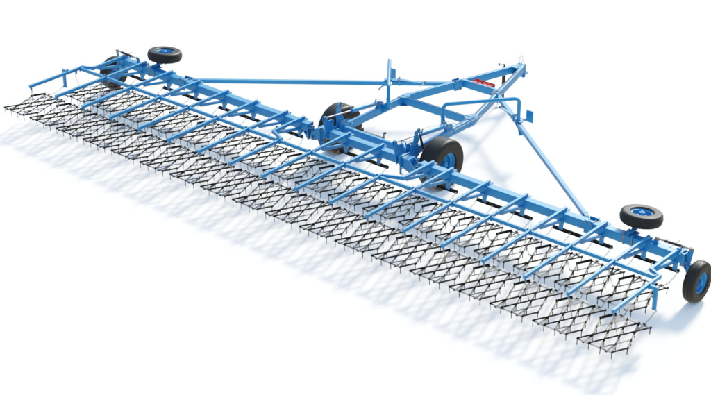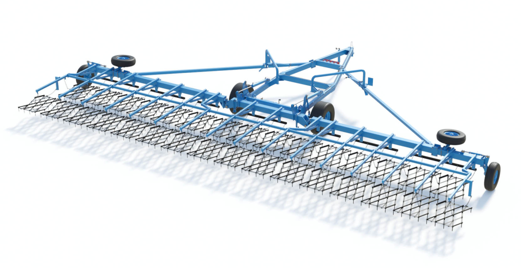 Сцепка зубовых борон гидрофицированная ЗАРЯ СБГ-21-1. Ширина захвата сцепки — 21 м. Производительность 25 гектаров в час.
