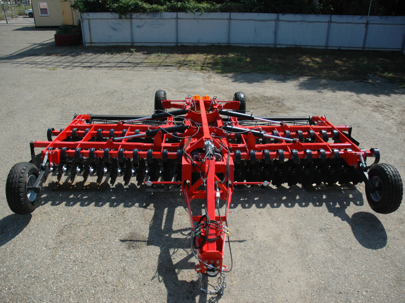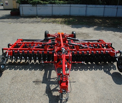 Большая рабочая скорость обработки (до 18 км/ч) позволяет достигать превосходного эффекта измельчения, перемешивания и улучшения крошения почвенного комка, благодаря полному перекрытию рабочей ширины рабочими органами и сдвоенным опорным шлейф-каткам разного диаметра. Вибрация пружинной стойки во время работы дополнительно улучшает крошение почвы. Глубина обработки до 12 см регулируется винтовым механизмом передних опорных колес и задними опорными катками. Сферические диски Bellota диаметром 560 мм установлены наклонно, на индивидуальных пружинных стойках Bellota в 2 ряда, что способствует лучшему обороту отрезаемого пласта, а также снижению требуемого тягового усилия трактора.