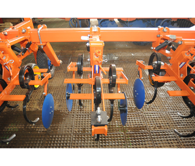 Параллелограммное устройство культиватора обеспечивает точное копирование рельефа почвы с уклонами более 5º, а наличие винтовой пары с упорной резьбой на стойке опорного колеса с мерной шкалой на каждой секции дает возможность точной регулировки глубины обработки.