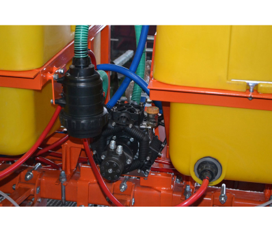 Система внесения жидких удобрений устанавливается на раму культиватора и легко демонтируется. Суммарный объём двух ёмкостей – 1200 л. Насос с гидроприводом итальянского производства способен обеспечить нормы внесения КАС от 30 до 300 кг/га. Регулировка нормы внесения осуществляется посредством распределителя – регулятора давления.