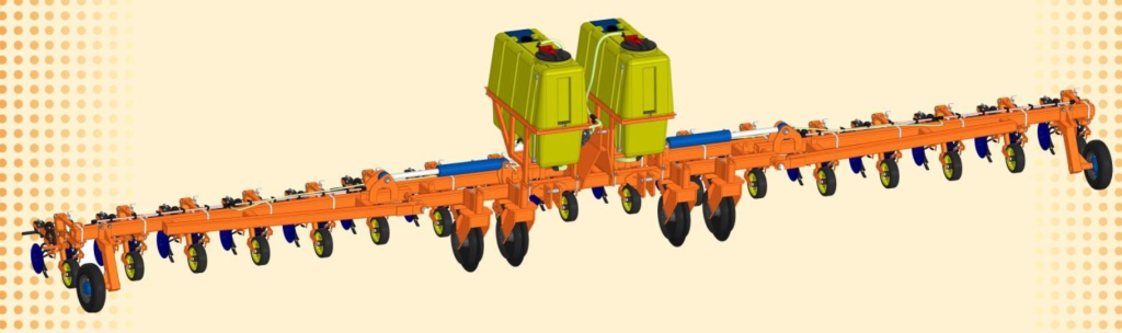 Культиватор переводится в транспортное положение путём складывания боковых крыльев вместе с установленной системой внесения удобрений.
