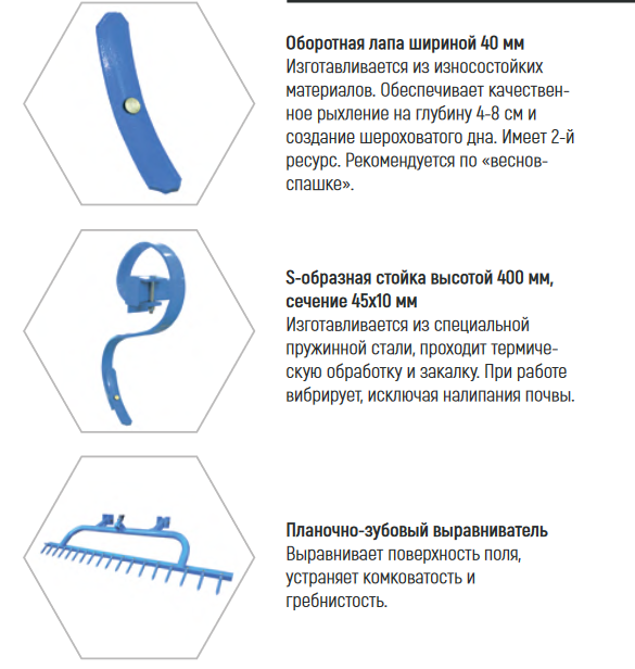 • комплектуются очень прочными и долговечными культиваторными лапами;