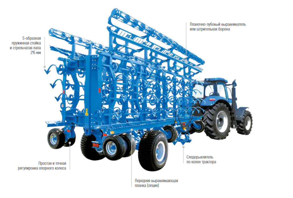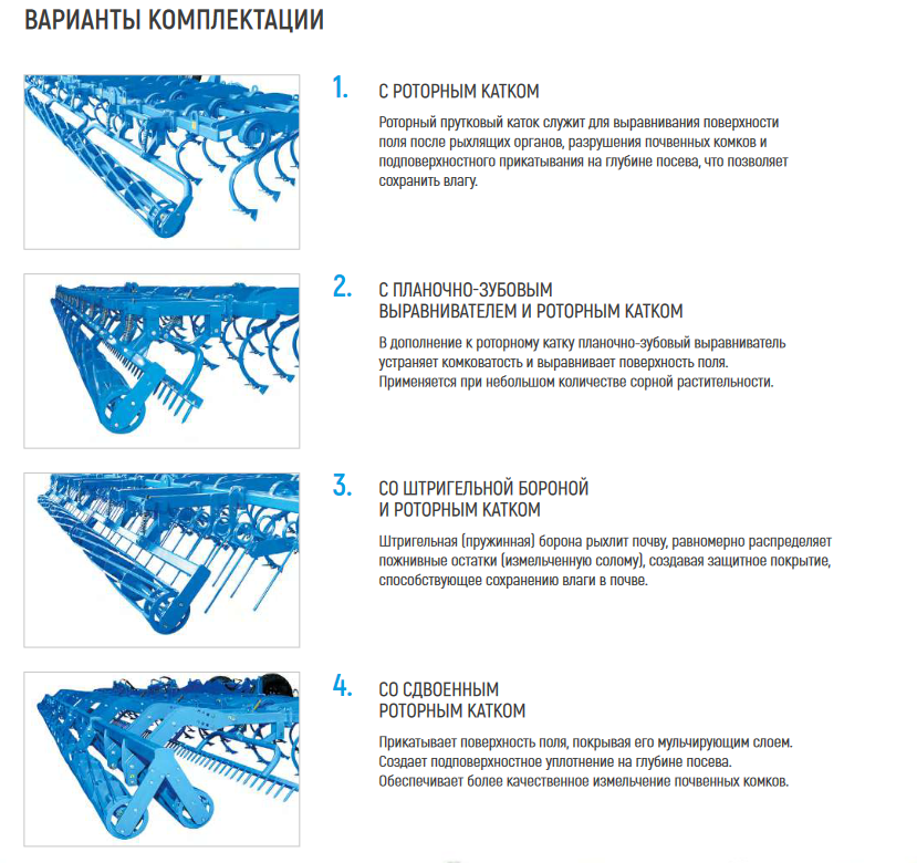 • 100% перекрытие пахоты. Рабочие органы культиватора расставлены в 4 ряда, что обеспечивает сплошное перекрытие обрабатываемой почвы и полное срезание сорной растительности даже при естественном износе стрельчатых лап в процессе эксплуатации.
